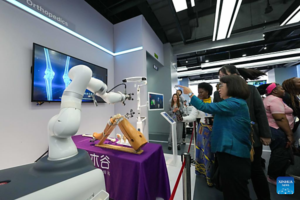 Representatives, who are in Beijing for the Global Leaders' Meeting on Women, learn about an AI-powered orthopedic robot at the Beijing World of Robots in Beijing, capital of China, Oct. 14, 2025. [Xinhua/Xue Yuge]