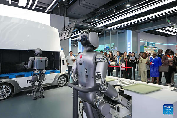 Representatives, who are in Beijing for the Global Leaders' Meeting on Women, watch a robot fetching medicine at the Beijing World of Robots in Beijing, capital of China, Oct. 14, 2025. [Xinhua/Xue Yuge]