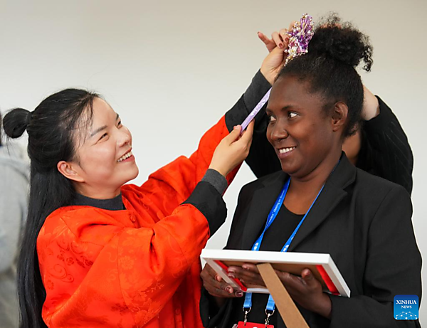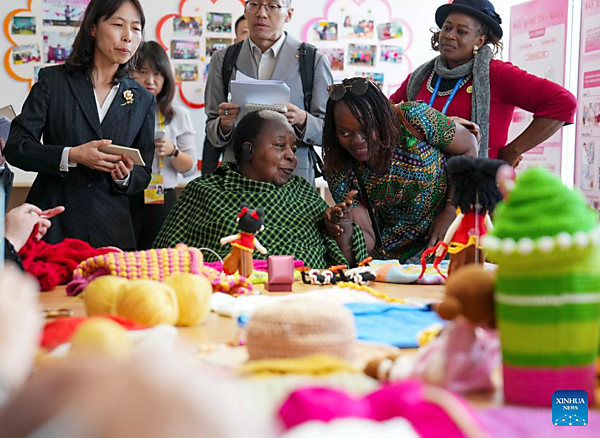 A representative, who is in Beijing for the Global Leaders' Meeting on Women, experiences handicrafts listed as intangible cultural heritage at a social service center for women and children in Shunyi District in Beijing, capital of China, Oct. 14, 2025. [Xinhua/Yan Linyun]