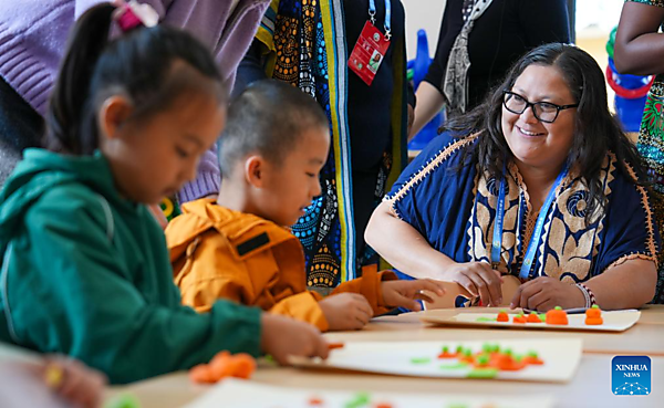 A representative, who is in Beijing for the Global Leaders' Meeting on Women, makes handiwork with children at a social service center for women and children in Shunyi District in Beijing, capital of China, Oct. 14, 2025. [Xinhua/Yan Linyun]