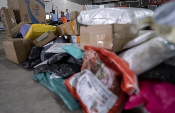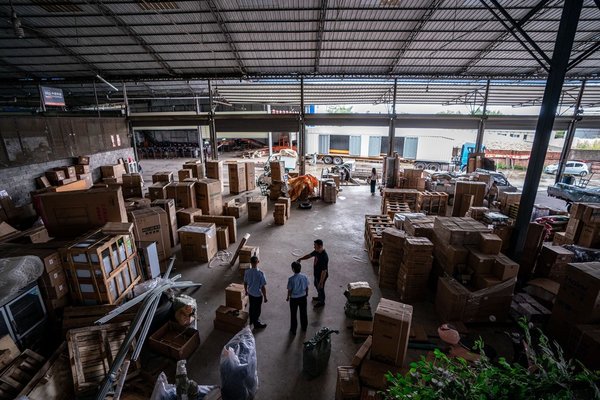 Yin Mingyan works with her colleague at a logistics center in Mangshi City, southwest China's Yunnan Province, July 12, 2023. [Xinhua/Hu Chao] |