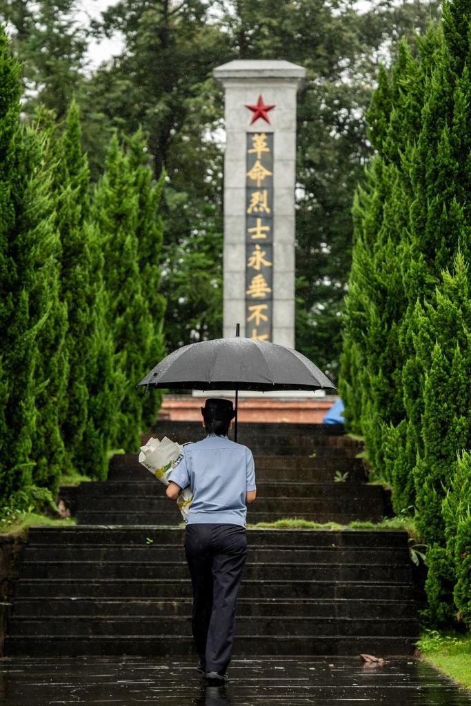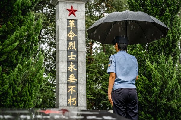 Yin Mingyan mourns her older brother Yin Mingzhi at a martyrs cemetery in Longchuan County, southwest China's Yunnan Province, July 12, 2023. [Xinhua/Fei Maohua] |