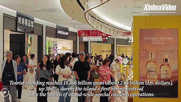 China's tropical island Hainan received over 12.32 million tourist visits during the 2026 Spring Festival holiday, a 28.9% increase year-on-year. Tourist spending reached 18.366 billion yuan (about 2.65 billion U.S. dollars), up 30.7%, during the island's first Spring Festival since the launch of island-wide special customs operations.